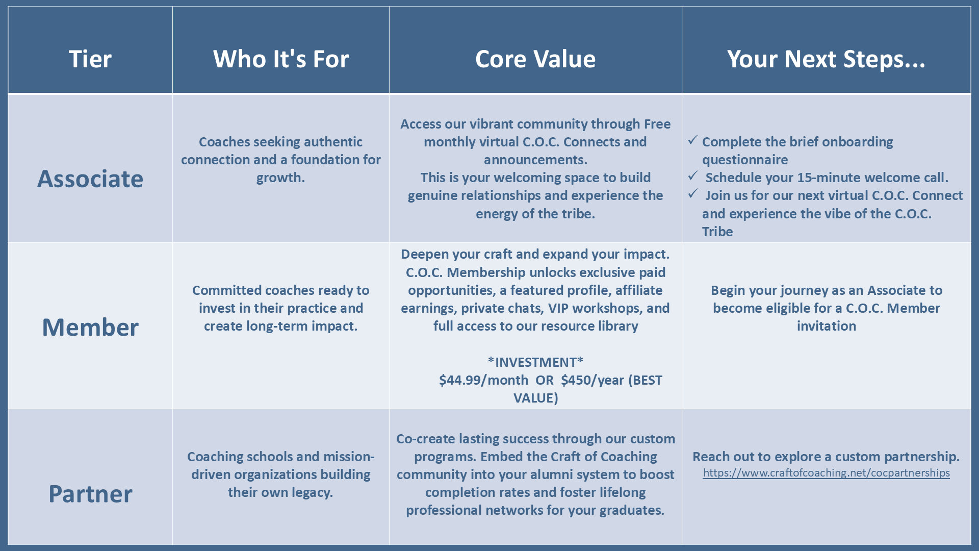 Below is a video highlighting community members sharing how the Craft of Coaching has been a valuable resource for their coaching practice and beyond.